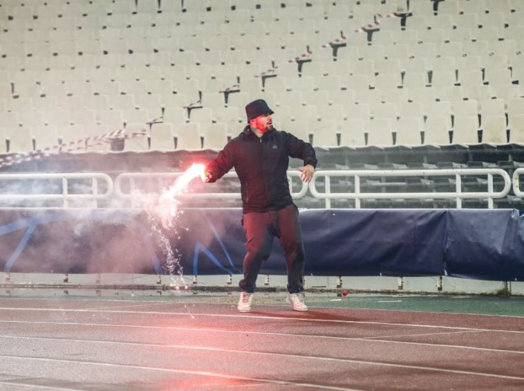 מספר אוהדים יוונים פרצו למגרש לפני פתיחת המשחק, החלו להתקרב ליציע שמאכלס את אוהדי אייאקס והשליכו לעברם אבוקות, רימונים, בקבוקי תבערה וחזיזים. כתוצאה מכך, חלק מהיציע עלה באש, מספר הולנדים נפצעו והחלו לדמם, המשטרה מיהרה להפריד בין הצדדים ובמקום התפתחה מהומה גדולה יותר.