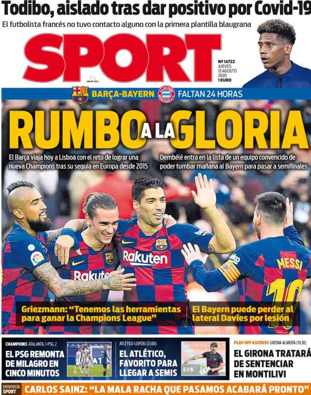 ברצלונה תמריא בהמשך היום (חמישי) לליסבון לקראת רבע גמר ליגת האלופות נגד באיירן מינכן מחר (שישי), ובמועדון יש התרגשות עצומה, בתקווה להעפיל לחצי הגמר ולהתקרב לתואר בו לא זכתה מאז עונת הטרבל ב-2015, אז פירקה 0:3 את הגרמנים בחצי הגמר בספרד. "הדרך לתהילה", נכתב בשער עיתון "ספורט", שם בטור דיעה ציינו כי ברצלונה סוף סוף לא פייבוריטיות וזה בהחלט עשוי לשחק לטובתה.