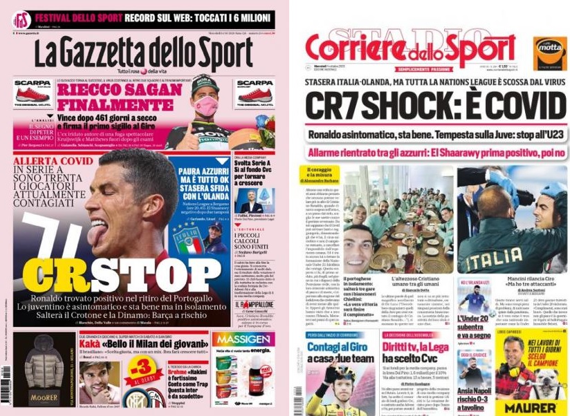 "CRStop", הייתה הכותרת ב"גאזטה דלה ספורט". "המשחק נגד בארסה בסיכון". "רונאלדו בהלם, זו הקורונה", נכתב ב"קוריירה דלה ספורט". ב"טוטוספורט" הכותרת הייתה אופטימית יותר: "מסי – אני אהיה שם! הפורטוגלי מרגיש טוב ויעשה הכל כדי לשחק".