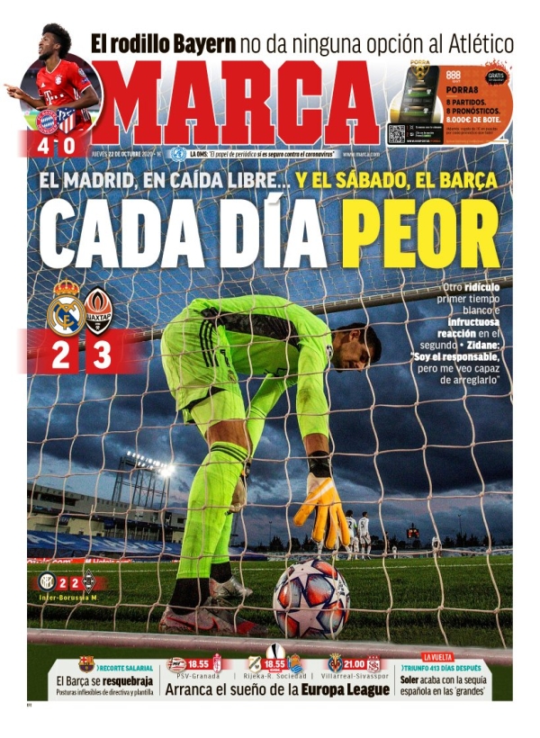 התקשורת הספרדית קוטלת את זידאן וחניכיו ללא הפסקה, כמובן. "בכל יום זה נראה רע יותר", נכתב בשער העיתון. "ריאל מדריד נכנסת לבור אחרי עוד מחצית ראשונה איומה וליגת האלופות בסכנה. היא בגדה בהיסטוריה שלה והפסידה במגרש על שם האגדה. הקבוצה הזו היא אסון", נכתב בנוסף, ואף העלו נקודת דמיון בין מה שקרה עכשיו לבין הסיוטים עם ז'ולן לופטגי שהגיע לקלאסיקו בקאמפ נואו לפני שנתיים בתקופה רעה מאוד והובס 5:1. עוד נכתב כי בניגוד להתטבאויותיו, זידאן נראה חסר אונים ולא דרבן את השחקנים אחרי שהשיגו את השער השני. "מגוחכים לקראת הקלאסיקו – ריאל שילמה על אחת המחציות הגרועות ביותר שלה בשנים האחרונות ועל השטויות של זידאן", נכתב ב"אס".