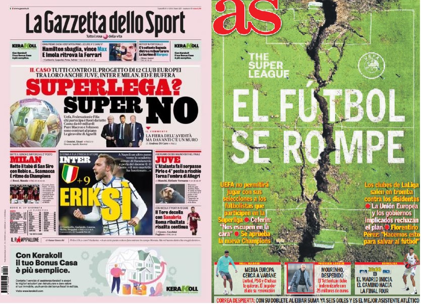 * בכלי התקשורת ברחבי העולם ממשיכים לכעוס על מה שעתיד לקרות לכדורגל. "הכדורגל נשבר", נכתב בשער "אס" בצורה יצירתית על רקע תמונה של מגרש נחצה לשניים כמו ברעידת אדמה. ב"גאזטה דלה ספורט", העיתון הגדול באיטליה, נכתב בפשטות: "סופרליג? – סופר לא". "כולם נגד הפרויקט של 12 המועדונים האירופאיים. זו סערה לכל דבר".