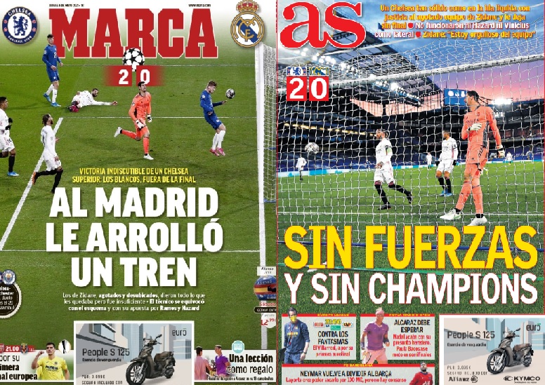 בשער "מארקה" נכתב: "ריאל נדרסה על ידי רכבת". נטען כי הבלאנקוס נתנו כל מה שהיה להם אך זה פשוט לא הספיק והאנגלים היו הרבה יותר טובים. "ריאל הייתה מותשת ולא עמדה טוב על המגרש". בכתבה אחרת הציגו את כל ההחמצות של הבלוז שהיו יכולים לסגור עניין הרבה יותר מהיר. ב"אס" נטען כי ריאל לא יכולה להתלונן. "בלי כוחות ובלי הצ'מפיונס" הייתה הכותרת בשער ה"אס" על רקע השוער טיבו קורטואה עם הקפטן ראמוס, שאגב, ייתכן והיה זה משחקו האחרון בליגת האלופות במדי הקבוצה. "צ'לסי חיסלה את הקבוצה של זידאן כמו במשחק הראשון. שום דבר לא עבד".