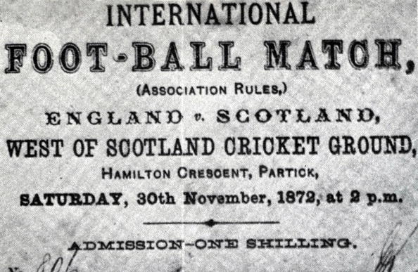 30 בנובמבר 1872, אצטדיון "המילטון קרסנט" בפרברי גלאזגו, כ־4,000 צופים נלהבים ו־22 שחקנים חובבים שלא לגמרי סגורים על החוקים. היה זה המשחק הבינלאומי הראשון בהיסטוריה, או כך לפחות הוא רשום בספרים של פיפ"א. המארחת סקוטלנד הביאה את כל הסגל מקבוצת אחת בשם קווינס פארק. הקפטנים היו גם המאמנים ובחרו את ההרכב ואת המערך, אם אפשר להשתמש במונח הזה. במחצית הכניסו שתי הנבחרות שחקני שדה בין הקורות ונתנו לשוערים לשחק כחלוצים. למרות זאת, העסק הסתיים בתיקו מאופס. לפי הדיווחים בתקשורת באותם ימים, "המשחק התעלה לרמה גבוהה". לא בטוח שהיה להם קנה מידה נכון לבחון זאת.