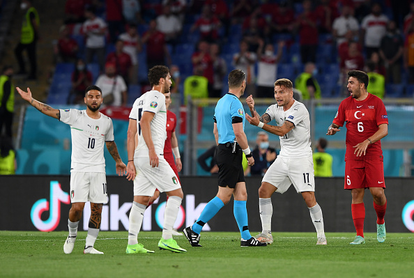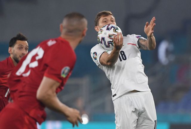 איטליה שלטה באופן מוחלט במחצית הראשונה, ולמעשה בעטה לא פחות מ-14 פעמים לעומת אפס הזדמנויות של הטורקים. אך מתוכן רק שלוש הגיעו למסגרת, כאשר המצב המסוכן ביותר היה שייך לקייליני שעלה לכדור קרן ושלח נגיחה חזקה שנהדפה על ידי צ'אקיר. על סף המחצית המארחת ספק קופחה לאחר שצ'ליק נגע בידו, אך השופט דני מקלי החליט להמשיך את המשחק כסדרו לאחר בדיקה ב-VAR.