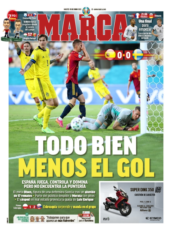 לא כך ציפתה נבחרת ספרד לפתוח את היורו – עם תיקו 0:0 אתמול (שני) נגד שבדיה במשחק שהעלה מחדש את כל הספקות לגבי הנבחרת. "לה רוחה" החזיקה בכדור 85.1% מהזמן – הנתון הגבוה ביותר בטורניר איי פעם (מאז החלו לבדוק את הנתונים מאז 1980) וגם זה לא עזר לה. לואיס אנריקה, שספג ביקורת קשה עוד בקביעת הסגל שלו, היה למאמן הראשון של הנבחרת שמסיים פעמיים ברציפות ב-0:0 מאז עשה זאת חאבייר קלמנטה ב-1992.