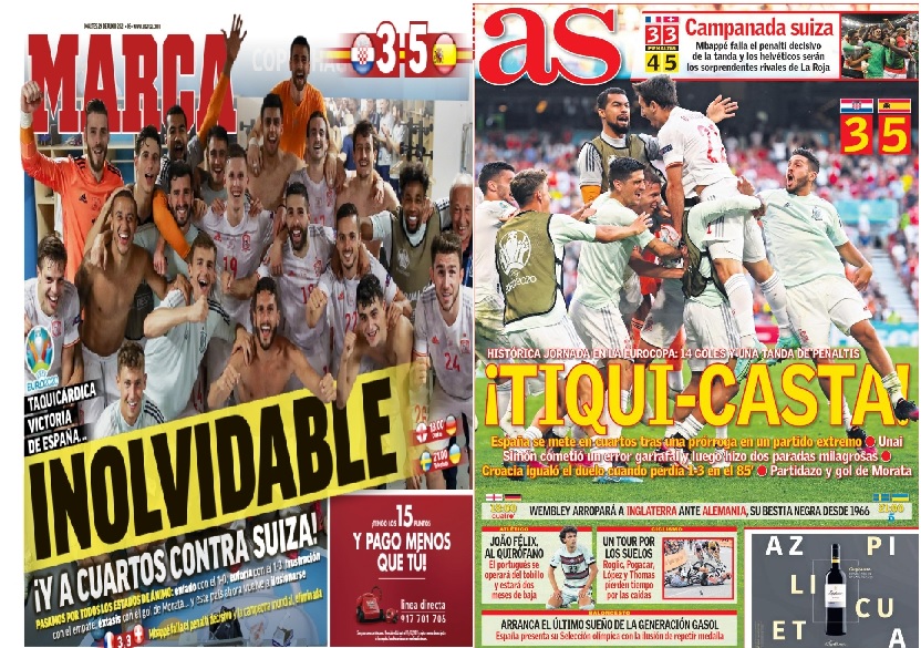 "בלתי נשכח, עברנו את כל מצבי הנפש האפשריים והלב פועם חזק אחרי משחק כזה", נכתב בשער "מארקה". "ספרד הזו ממש מגניבה. היא מתחברת ואחרי משחק היסטורי לחלוטין היא מתקרבת לגן עדן. המשחק הזה יישאר בספרדים". "ספרד ברבע הגמר אחרי משחק הירואי. סימון ביצע שגיאה מביכה אבל ענה עם שתי הצלות מדהימות, פארטידזו (משחק גדול) למוראטה", נכתב בשער "אס". "ספרד הזו היא טירוף מבורך", נכתב בידיעה אחרת. "השערים של מוראטה ומיקל אויארסבאל בהארכה מאפשרים לנבחרת להתאושש מהשגיאה של סימון וכן מבזבוז יתרון ה-3:1".
