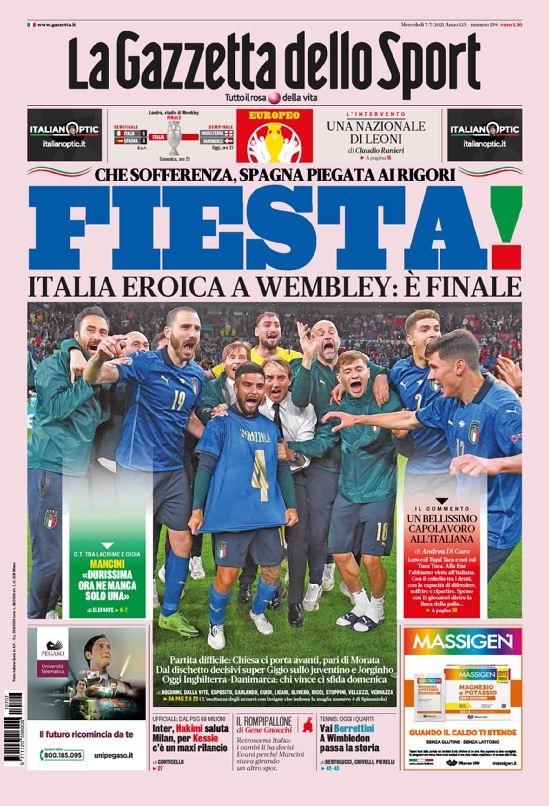 "פיאסטה (חגיגה). איטליה ההירואית סבלה אבל העפילה לגמר. זו יצירת מופת איטלקית. אנחנו לא הכי חזקים מכולם אבל אנחנו לא מפחדים מאף אחד", נכתב ב"גאזטה דלה ספורט". צמד הבלמים ג'ורג'יו קייליני ולאונרדו בונוצ'י קיבלו את הציון הגבוה – 7. בכלי התקשורת הציגו סרטון מפואר של שתי דקות מהרגע בו כבש ז'ורז'יניו את הפנדל המכריע והציגו את הטירוף של האוהדים ברחובות. קלואדיו ראניירי בירך: "נבחרת של אריות, נחזור לוומבלי עם הראש למעלה". "איטליה ההירואית מחסלת את ספרד", נכתב ב"טוטוספורט". "קייזה סחף את מנצ'יני, מוראטה השווה ואז 'בגד' בלואיס אנריקה'. "שערי הכנסייה נפתחו. ז'ורז'יניו עמד בלחץ, מנצ'יני משחק אחד מהתואר", נכתב ב"טוטוספורט". "איטליה חולמת בסופו של דבר", נכתב ב"קוריירה דלה ספורט".