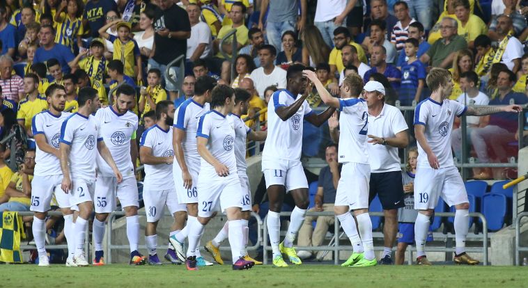 המשחק התחיל רע עבור החבורה של ולדאן איביץ', שנקלעה לפיגור כבר בדקה העשירית ואחרי טעות שלה בהגנה הכדור הגיע לדניס ווינוב, שאומנם היה בעמדת נבדל, אך בעט כדור שטוח לרשת של פרדראג ראיקוביץ' והשער אושר למרות מחאות שחקני המארחת. הצהובים לא ויתרו ויצאו להתקפות בצד השני, אך למרות הזדמנויות של דור מיכה ועומר אצילי ירדו להפסקה בפיגור 1:0.