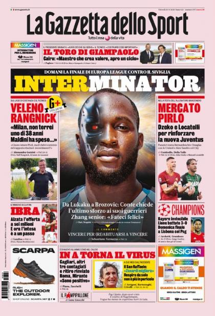 "קונטה מחפש דחיפה אחרונה ומאמץ נוסף מהלוחצים שלו", נכתב בשער "גאזטה דלה ספורט" שם הגדירו את רומלו לוקאקו כבעל הבית של אינטר. בעלי המועדון פנה לשחקנים ואמר להם: "תעשו אותנו מאושרים". זכייה בתואר תהיה שווה לאינטר 25 מיליון יורו. "אינטר צריכה לזכות בתואר כדי להחזיר את ההרגל של הניצחון. הפרויקט אמנם צומח, אך גביע הוא חלון ראווה, בתקווה לעוד כמה רכישות גדולות בשוק", נכתב בטור דיעה.