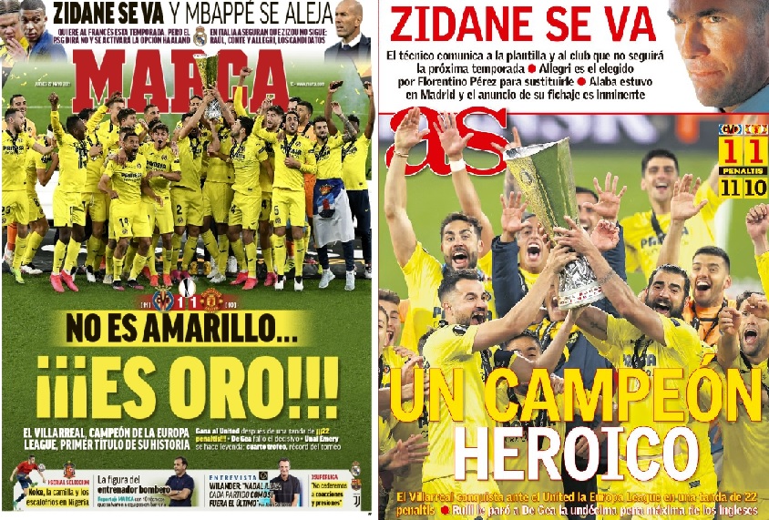 בספרד שיבחו כמובן את הצוללת וחגגו יחד איתה את ההישג. "זה לא צהוב – זה זהב!", הייתה הכותרת בשער "מארקה", שם נכתב על דו קרב פנדלים שייכנס להיסטוריה. "החלום של העם הפך למציאות" ו"אמרי ממשיך את האגדה שלו עם הזכייה הרביעית, זה המפעל שלו" היו כותרות נוספות. "אלופה הירואית", הייתה הכותרת ב"אס". "הם עשו היסטוריה, ויאריאל הפכה לקבוצה השביעית שזוכה בגביע אירופי", נכתב. "זו הגאווה של הכדורגל הספרדי". גם באנגליה אגב פרגנו, שם נכתב על "שיעור ענק" שהעביר אמרי לאולה גונאר סולשיאר.