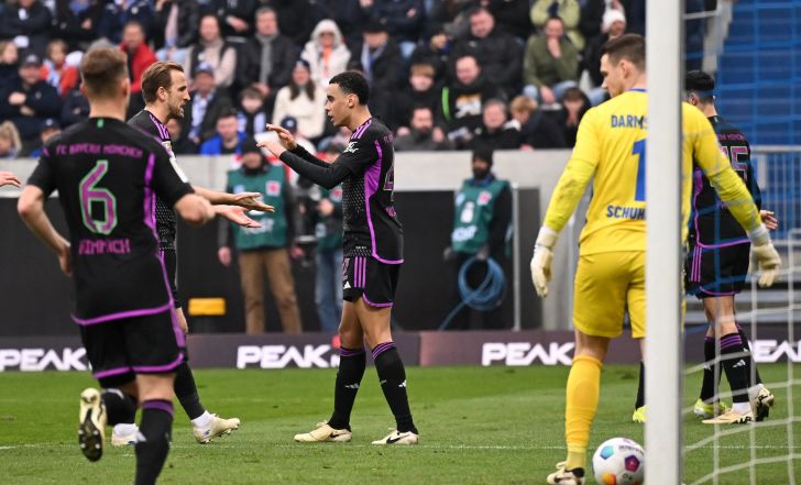 נכון שבסיום באיירן מינכן הביסה, אבל מי שהובילה ראשונה הייתה דרמשטאדט שנהנתה משער של טים סקארקה בדקה ה-28. היה זה שער שהעיר את האורחים, שעד המחצית הפכו אחרי שהארי קיין בישל לג'מאל מוסיאלה (36) וקיין קבע 1:2 דקה בתוך תוספת הזמן של החצי הראשון והגיע ל-37 שערים ו-12 בישולים בכל המסגרות, הראשון להגיע ל-31 שערי בונדסליגה בעונתו הראשונה, אבל הוא גם נפגע לקראת הסיום ובקבוצה יקוו שלא מדובר בפציעה שתמנע ממנו לשוב מפגרת הנבחרות. ובחזרה למשחק: מוסיאלה השלים צמד בדקה ה-64 וכעבור 10 דקות בישל לסרג' גנאברי. מאתיס טל קבע 1:5 שלוש דקות בתוך תוספת הזמן וכעבור דקה אוסקר וילהלמסון צימק וקבע את תוצאת הסיום. הפער מהפסגה שוב שבע נקודות, אבל לברקוזן תפגוש מחר את פרייבורג.