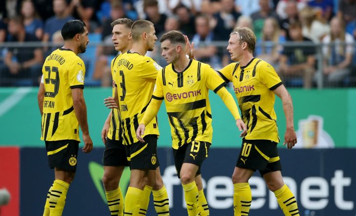 קבוצות הבונדסליגה ממשיכות לדלג על פני השלב הראשון בגביע הגרמני, שבוע לפני מחזור הפתיחה בליגה. אחרי הרביעייה הקלילה של באיירן מינכן על אולם בשישי, חגגה הערב (שבת) בורוסיה דורטמונד רביעייה משלה עם 1:4 בחוץ על פיניקס לובק מהליגה הרביעית. ולדמאר אנטון, בלם הרכש משטוטגרט, מצא את הרשת כבר בדקה השלישית ואמרה ג'אן (31) ויוליאן בראנדט (45+1) הבטיחו לנורי שאהין ניצחון בכורה כמאמן ראשי בקבוצה בה שיחק, עוד לפני סיום המחצית הראשונה. אובינה אילוקה צימק עם שער נהדר בדקה ה-55, אבל הברזילאי החדש יאן קואוטו בישל בדקה ה-62 לז'וליאן דוראנוויל בן ה-18, שנכנס יחד איתו שלוש דקות קודם לכן וחתם את תוצאת המשחק.