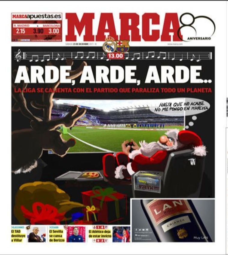 במדריד כבר לא יכולים לחכות לשריקה. הכותרת של "'מארקה" היתה : "רותח רותח רותח", ומתחת לתמונה של סנטה קלאוס צופה בקלאסיקו נכתב: "עד שהמשחק לא נגמר – אני לא מתחיל לעבוד".