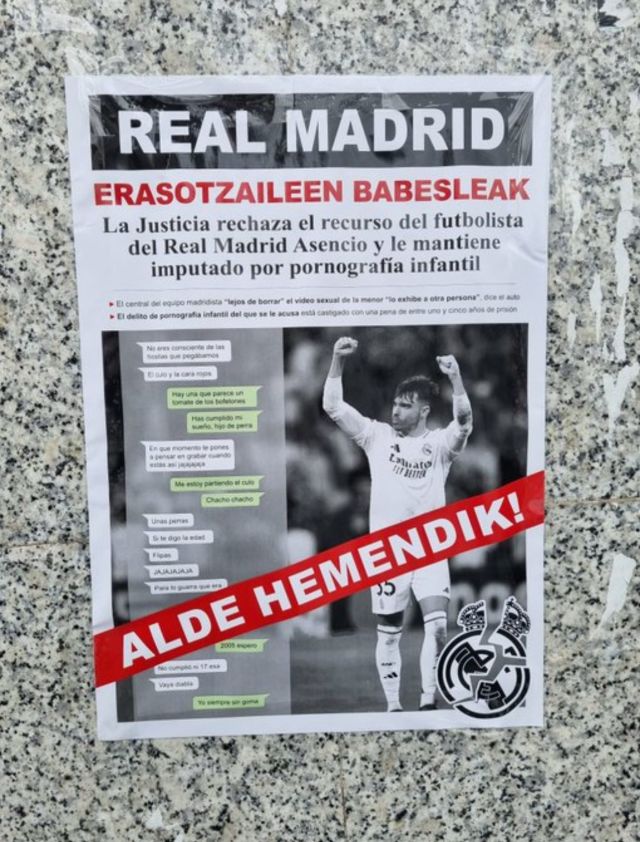 סערה מתגבשת סביב ראול אסנסיו באצטדיון מנדיזורוזה. ההכנות למשחק היום בין אלאבס לריאל מדריד (17:15) לוו בהופעת מספר עותקים של כרוז התוקף ישירות את הבלם הספרדי.
