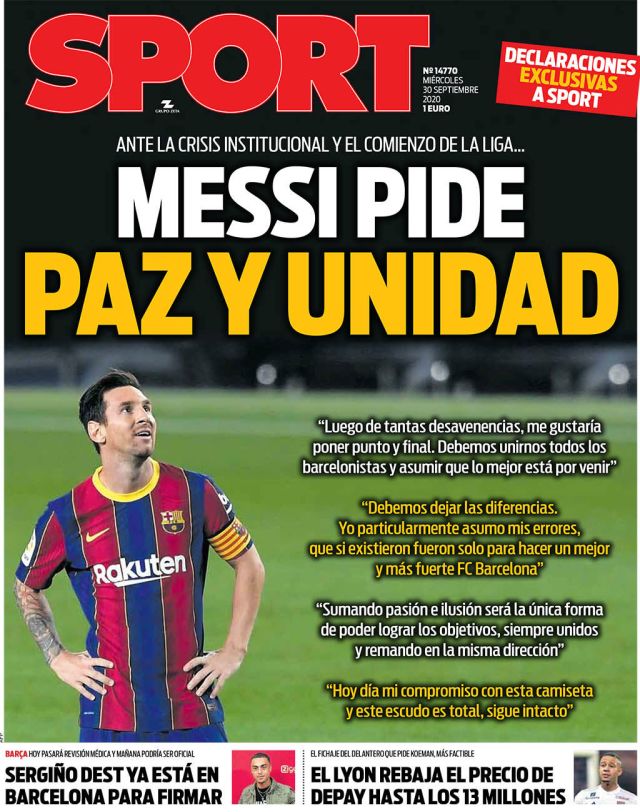בראיון נרחב ל"ספורט" אמר מסי: "אחרי כל כך הרבה חילוקי דעות, אני רוצה לשים לזה סוף. כל אוהדי בארסה חייבים להתאחד ולהניח שהטוב ביותר עוד יבוא. מה שהיה – היה, הקבוצה הזו תיתן את הכל כדי לשמח את הקהל ולזכות בתארים".