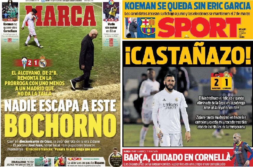 "אף אחד לא יכול לברוח מהמבוכה הזו", נכתב בשער "מארקה" על רקע תמונה של המאמן שפוף. "אלקויאנו מהליגה השלישית ביצעה מהפך עם שחקן אחד פחות. זה ההפסד הכי גרוע בעידן זידאן והשחקנים היו אימפוטנטים", נכתב. עוד נכתב כי מדובר בהפסד עלוב יותר מאשר התבוסה 4:0 לאלקורקרון ב-2009. "כישלון מוחלט שלא יהיה אפשר לתקן אף פעם, אלקויאנו המפוארת זרקה את ריאל מהגביע בלי רחמים", נכתב ב"אס". "המחליפים של זידאן יצאו מהמגרש גרועים מכפי שנכנסו וריאל נפרדה מהגביע באחת הדרכים הכי מגוחכות במאה השנים של המפעל. איסקו, ויניסיוס, פדה ואלוורדה, מריאנו דיאס – שחקנים שקיבלו הזדמנות די נדירה, וכך גם אלברו אודריוסולה – סיימו את המשחק עם הציון 0. "מה נותר לריאל חוץ מליגת האלופות?", נכתב. גם בקטלוניה חגגו: "קבוצה מהסגונדה ב' השפילה את זידאן ושחקניו מבלי שנדרשה אפילו להגיע לפנדלים".