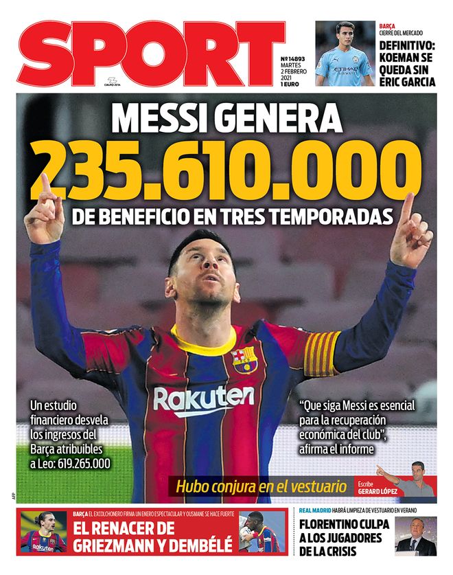 ספרד עדיין סוערת מחשיפת חוזה העתק של ליאו מסי בברצלונה. הבוקר (שלישי) פורסם בעיתון "ספורט" מחקר שחישב את התועלת הכלכלית והרווחים שמסי מכניס לברצלונה מאז 2017. מדובר, כך לפי המחקר, בסכום עתק של 619.2 מיליון יורו. הכתבה נפתחת בצורה הדרמטית הבאה: "אדם הצליח למצוא פיתרון למדוד כל דבר אפשרי – משקל, מרחק, אנרגיה ומסה, אבל האם אפשר לחשב אושר? לכמת רגשות? עדיין לא".