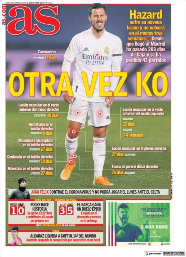 בריאל מדריד עדיין לא מעכלים שזה שוב קורה להם, כאשר אדן הזאר נפצע בפעם העשירית (!) מאז תקופתו במועדון (יחד עם היעדרות בת שבועיים בשל נגיף הקורונה. "שוב נשבר", נכתב בשער עיתון "אס", שם הציגו את הדו"ח המלא על כל הפציעה בחלוקה לשרירים ומשך היעדרות. באתר הזכירו אותו עם שחקנים שבריריים אחרים שדרכו במועדון כמו גארת' בייל, אריאן רובן, קאקה וג'ונתן וודגייט (החמיץ את כל העונה הראשונה בקבוצה ורשם 14 משחקים בשנתיים). מעבר לכך, בספרד התפתח דיון בקרב הפרשנים האם הבלאנקוס צריכים לוותר על שחקן הרכש היקר שלהם.