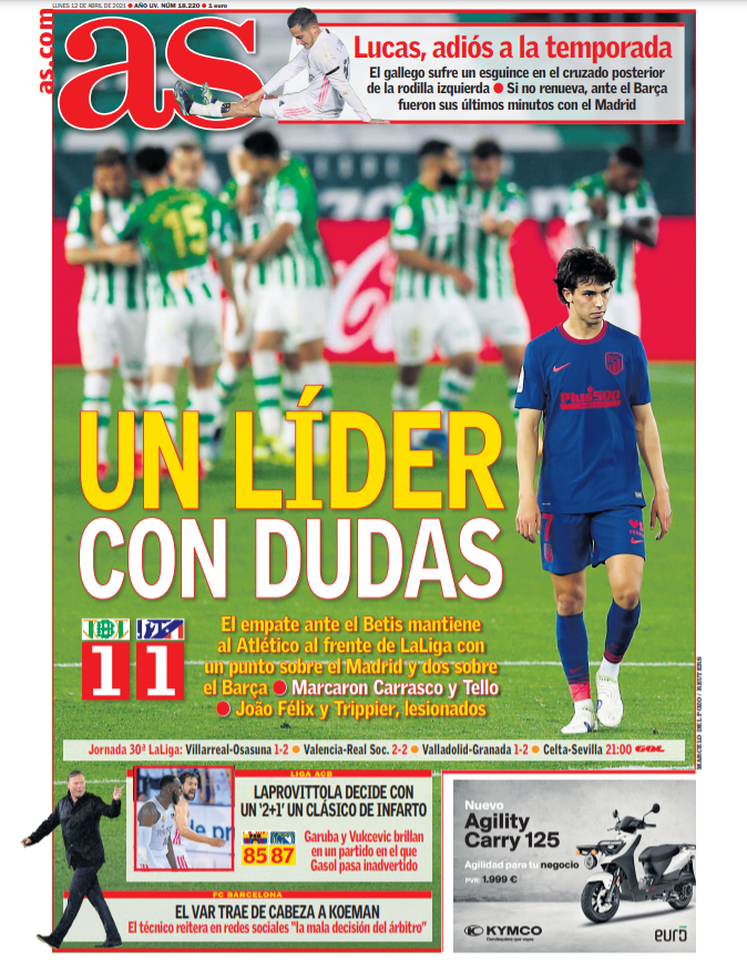 "פייבוריטית – לא לזכות בתואר", נכתב בצורה נחרצת ב"מארקה". "הנקודות נעלמות, הפציעות מצטברות והסבל עד תום העונה רק יגדל". נכתב כי הסגל של אתלטיקו פשוט לא מתאים להתחרות בריאל ובארסה והדגישו את הספסל החלש עמו הגיעה למשחק. "נאחזת בפסגה לפי יכולתה", נכתב בשער "מארקה" על רקע תמונה של המאמן סימאונה מחבק את אנחל קוראה. "מוליכה עם לא מעט ספקות", נכתב ב"אס" על רקע תמונה של פליקס מאוכזב למראה שחקני בטיס חוגגים את השוויון. "אתלטיקו מאשימה את הסגל שלה. היא סיימה בתיקו במשחק בו יכלה לנצח אבל חיבקה לבסוף את הנקודה". נכתב כי לאחר המחצית הראשונה הטובה – הקבוצה התעייפה.