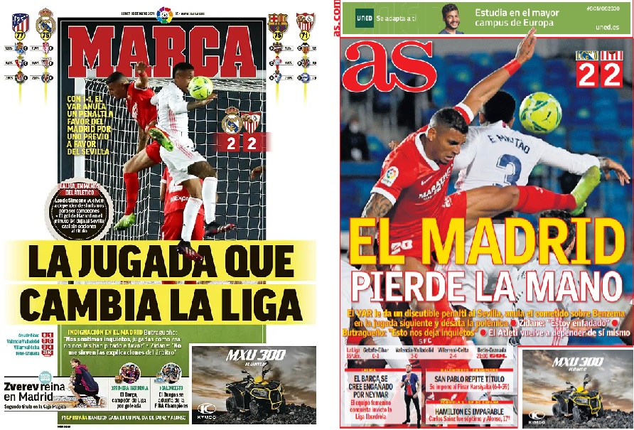 ריאל מדריד הייתה צריכה רק לנצח את סביליה אתמול (ראשון) כפי שעשתה ב-11 משחקי הבית הקודמים, על מנת להעפיל לפסגה ולהיות תלויה בעצמה במאבק האליפות. אלא שהבלאנקוס הצליחו רק לסחוט 2:2 דרמטי בתוספת הזמן ונותרו שתי נקודות מאתלטיקו מדריד. רק פעם אחת העונה הצליחה ריאל לנצח כשנקלעה לפיגור ביתי. בכל מקרה, את הדקה ה-77 לא ישכחו בספרד זמן רב. לראשונה מאז השימוש ב-VAR, השופט נקלע למצב בו עליו להחליט איזה פנדל לשרוק. אדר מיליטאו נגע בכדור בידו לאחר כדור קרן ובהתקפת הנגד קארים בנזמה הוכשל על ידי השוער יאסין בונו. השופט העניק פנדל לאנדלוסים שכבשו.