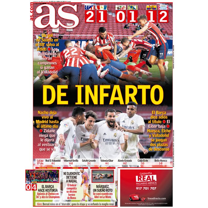 התקשורת בספרד כמובן בטירוף. "סוארס הוכיח שזה הרגע שלו", "איזו מתנה יפה הוא העניק לאתלטיקו", "לדברים טובים צריך להמתין", אלה היו רק חלק מהכותרות. עוד נכתב: "19 דקות של טירוף – אופוריה בריאל מדריד וייסורים של אתלטיקו" ו"התקף לב", כפי שנכתב בשער "אס". יאניק קראסקו זכה למחמאות על היכולת שהפגינו. הבלם סטפן סאביץ' יחסר במחזור הסיום החגיגי שכן הוא מושעה בגלל צהובים.