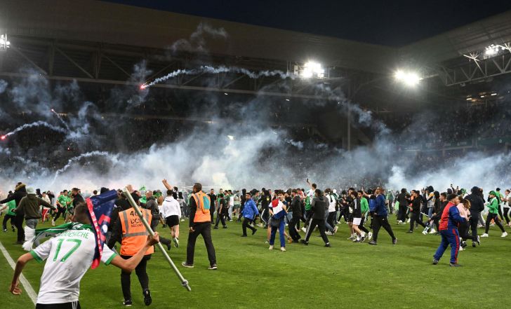 עונת הבלהות של סנט אטיין הסתיימה הערב (ראשון) עם ירידת ליגה כואבת באצטדיון הביתי, אחרי הפסד 5:4 בפנדלים לאוקזר במשחקי המבחן – 1:1 בחוץ וכך גם הערב ב-120 דקות. מועדון הפאר שזכה 10 פעמים באליפות צרפת, נפרד מהליג 1 אחרי 18 שנה והאוהדים התקשו להשלים עם הבשורה ופרצו למגרש עם אבוקות, חזיזים ורימוני עשן.