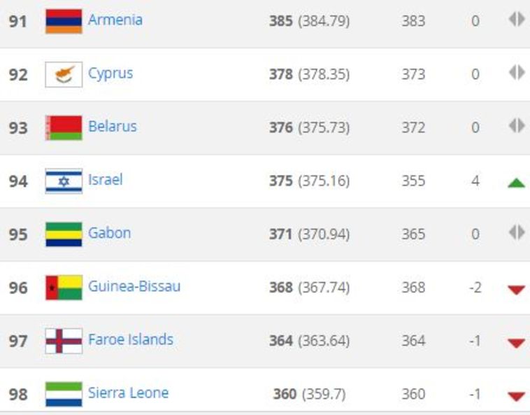 למרות שלא שיחקה בחודשים האחרונים, נבחרת ישראל עלתה ארבעה שלבים בדירוג פיפ"א שפורסם היום מ-98 ל-94 ותפגוש בשבת הבאה את רומניה שמדורגת במקום ה-36.