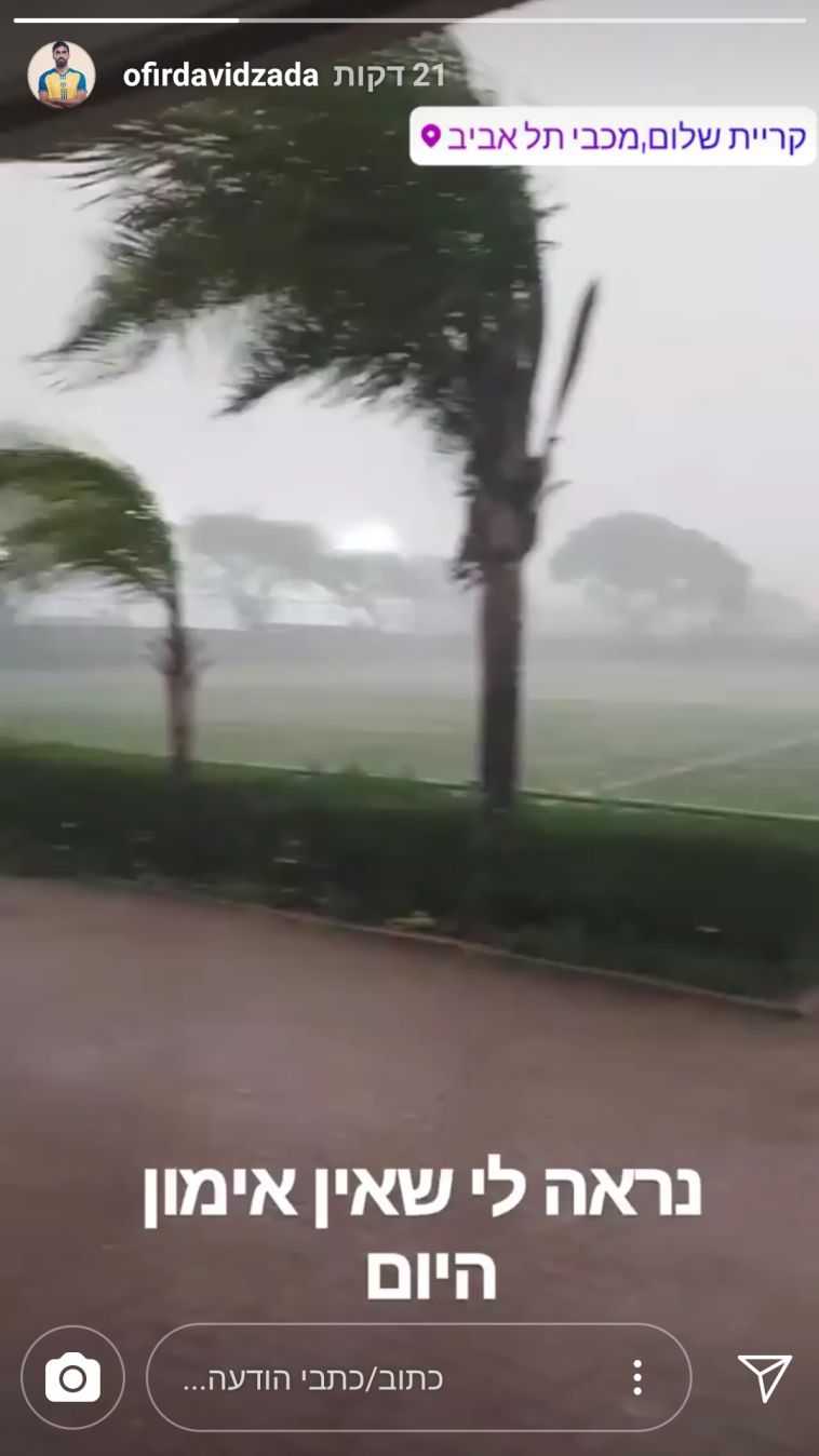 מכבי תל אביב הייתה אמורה לקיים אימון אחר הצהרים, אך כאשר השחקנים והצוות הגיעו למגרש בקריית שלום הם גילו שהוא מוצף לחלוטין והאימון נדחה למחר. אלירן עטר ואופיר דוידזאדה לא שכחו לצלם ולהעלות לאינסטגרם.