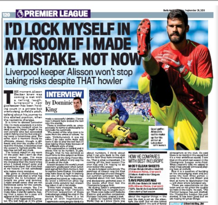 לראשונה מאז הטעות הקשה של אליסון מול לסטר כשאיבד את הכדור בגלל כדרור מיותר, התייחס השוער למה שקרה ובראיון ל"דיילי מייל" האנגלי דיבר על הקריירה שלו בליברפול, המשחק נגד צ'לסי, איך הגיע לאנפילד וגם על תג המחיר שלו: "פעם אחרי טעויות כאלה הייתי נועל את עצמי בחדר שלי ולא יוצא. היום אני כבר לא עושה את זה. התבגרתי. אני יודע להתמודד יותר טוב עם הטעויות שלי מאשר להסתגר בחדר ולא לצאת, אבל אם תסתכלו על ההיסטוריה שלי אני לא מאלה שעושים הרבה טעויות".