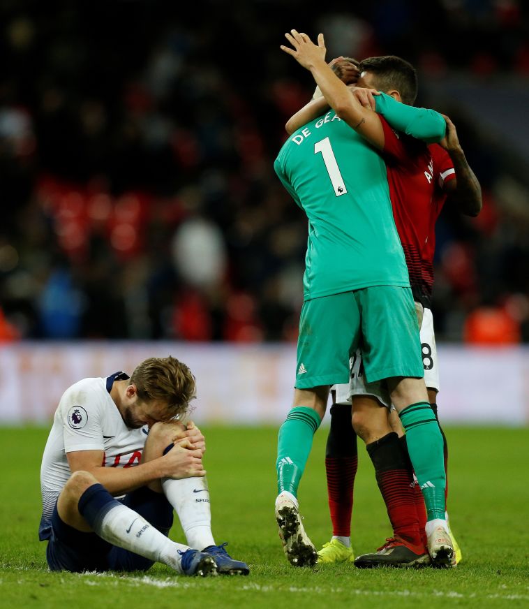 קיין נאנק מכאבים מיד בשריקת הסיום, לצדו גיבור הניצחון דוד דה חאה (AFP)
