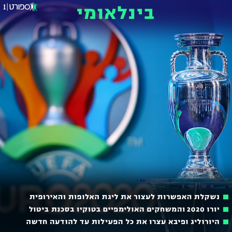 * אחרי הדיווחים ברחבי אירופה על כך שאופ"א תכריז על ביטול משחקי ליגת האלופות והליגה האירופית עד הודעה חדשה, בהודעה רשמית שנמסרה מהתאחדות הכדורגל האירופית נכתב שראשי הענף ייערכו שיחת וידאו ביום שלישי הבא (17.3) כדי להכריע את גורל המשך העונה. אז יתקבלו החלטות על עתיד הענף, כשבין היתר מדובר על קיום משחקי כל הליגות המקומיות, ליגת האלופות, הליגה האירופית, פלייאוף יורו 2020 ואליפות אירופה עצמה, שאמורה להיערך בקיץ ב-12 מדינות שונות. אחת האופציות, כך על פי דיווח ב'לאקיפ' הצרפתי, היא דחיית יורו 2020 בשנה.