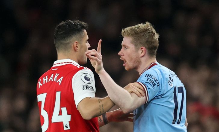 שחקן מנצ'סטר סיטי קווין דה בראונה מול שחקן ארסנל גרניט ג'אקה | רויטרס