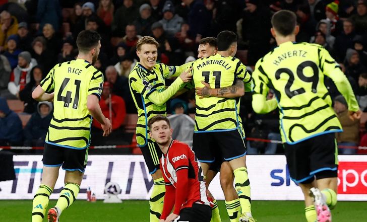 התותחנים הפכו לראשונים בתולדות הפרמיירליג שכובשים לפחות חמישייה בשלושה משחקי חוץ רצופים. אודגור, מרטינלי שגם נפצע, האברץ, רייס ובן וייט חגגו. הפער מהפסגה צומק שוב לשתי נקודות