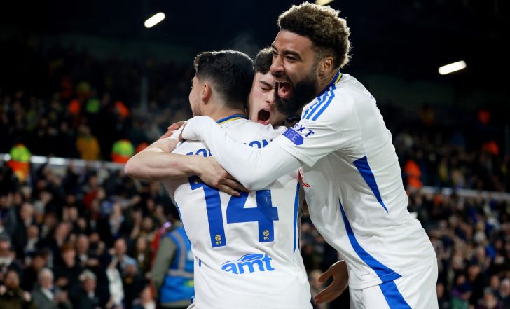 שחקני לידס מחבקים את מנור סולומון שכבש | רויטרס