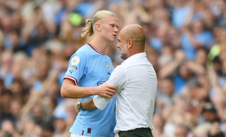 שחקן מנצ'סטר סיטי ארלינג הולאנד עם פפ גווארדיולה | GettyImages, Shaun Botterill