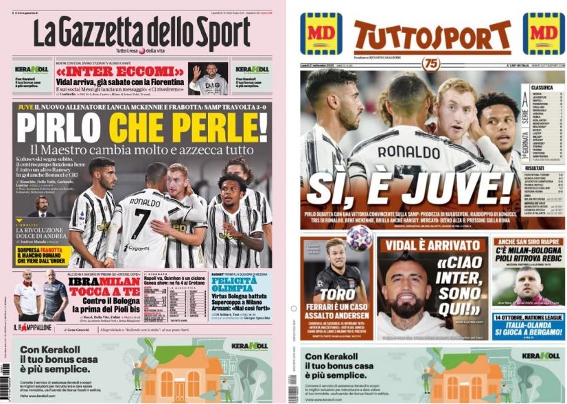 על פתיחה כזו כמאמן אנדראה פירלו היה יכול רק לחלום. יובנטוס התגברה אתמול (ראשון) על סגל חסר במיוחד והביסה 0:3 את סמפדוריה במחזור הראשון בסרייה א', במשחק הבכורה של האיטלקי כמאמן ראשי. זו הפעם החמישית ברציפות שיובה פותחת את העונה עם ניצחון – יותר מכל קבוצה אחרת. בתקשורת האיטלקית בירכו כמובן. "פירלו, איזה נהדר", נכתב ב"גאזטה דלה ספורט". ה"מאסטרו שינה כל כך הרבה והכל הסתדר. מרכז השדה עבד נהדר". "הופעת בכורה מנצחת עבור פירלו", נכתב ב"קוריירה דלה ספורט". ב"טוטוספורט" הוסיפו: "כן, זו יובה! פירלו יצא לדרך עם ניצחון משכנע על סמפדוריה".