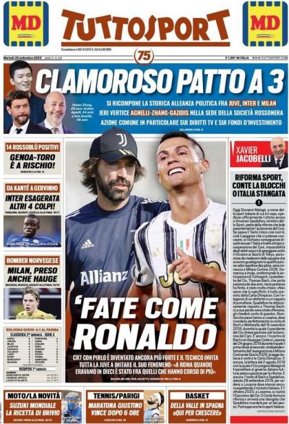 יובנטוס נתקלה בלא מעט קשיים נגד רומא , ואז היה לה את האיש למשימות מיוחדות – כריסטיאנו רונאלדו שכבש צמד בדרך ל-2:2. הפורטוגלי, כזכור, הגיע ל-450 שערים בשלוש הליגות הגדולות. אולם, המאמן אנדראה פירלו התרשם דווקא מהחוייבות שהפגין והריצה הבלתי פוסקת שלו כשקבוצתו נותרה בעשרה שחקנים. באיטליה נכתב כי המאמן הפציר בשחקניו: "תהיו כמו רונאלדו".