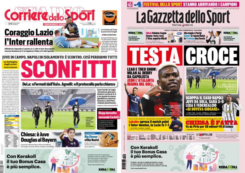 "תבוסה", נכתב בשער עיתון "גאזטה דלה ספורט". "יובה על המגרש ונאפולי בבידוד, מה שבטוח – בדרך הזו כולנו מפסידים". נשיא נאפולי טען כמובן: "ארגון ה-ASL עצר אותנו מלנסוע". עוד נכתב באיטליה כי מדובר בתוהו ובוהו של הקורונה. ב"טוטוספורט" נכתב: "המחלוקת בנאפולי התפוצצה – יובה הייתה לבדה וניצחה 0:3". מהליגה האיטלקית נמסר כי נאפולי הייתה חייבת להתייצב למשחק. ב"קוריירה דלה ספורט" נכתב: "אין כדורגל באצטדיון, אבל יש כאוס גדול בין הממשלה, הליגה, נאפולי וארגון הבריאות האיטלקי".