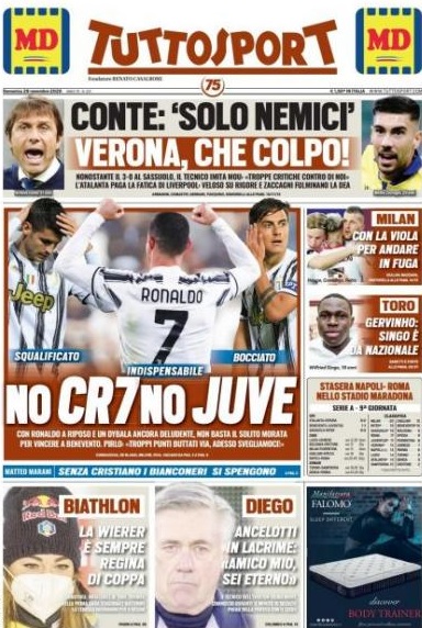 "יובה לא קיימת, איזו אכזבה. רונאלדו חסר", נכתב ב"גאזטה דלה ספורט" שם נמתחה ביקורת על מוראטה שכבש אך הורחק בחוסר אחריות וייעדר כאמור. "הרבה בעיות ליובה, אפילו לא יכלה לחגוג את השער השמיני של מוראטה" נכתב ב"קוריירה דלה ספורט". "הביאנקונרי מגמגמים ללא רונאלדו". "אין CR7 – אין יובה", הייתה הכותרת הדי חריפה ב"טוטוספורט". "כשרונאלדו במנוחה ופאולו דיבאלה שוב איכזב, מוראטה לא הספיק כדי לנצח את בנוונטו".