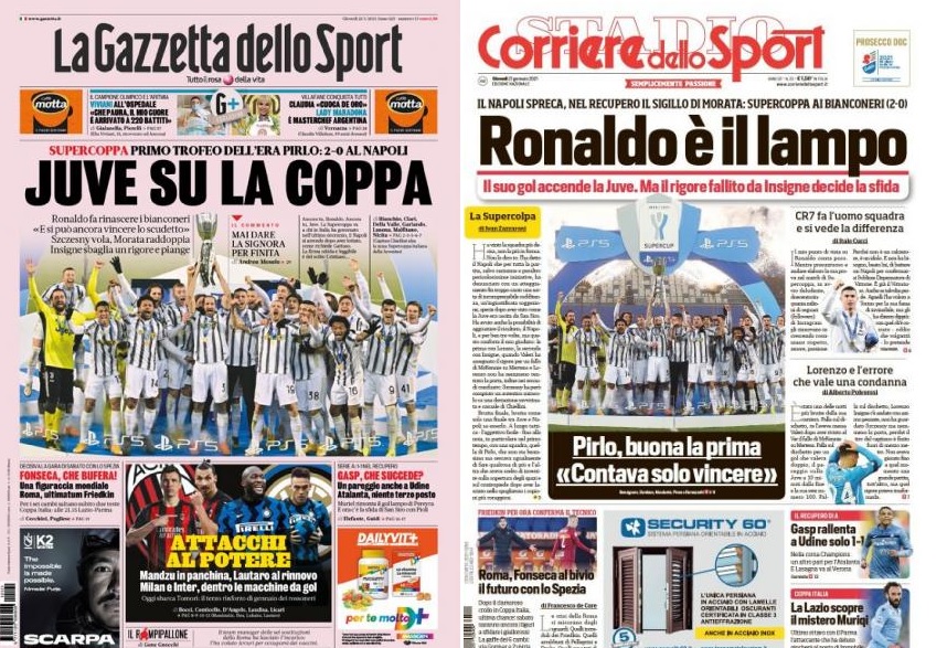 גם בכלי התקשורת, שקטלו את יובה בצדק ביום ראשון – פרגנו ובגדול. "יובה הרימה את הגביע, תואר ראשון בעידן פירלו. רונאלדו החייה את הביאנקונרי. ווישצ'ך שצ'סני עף, אלברו מוראטה מכפיל, לורנצו אינסינייה מחמיץ פנדל ובוכה". השוער הפולני קיבל את הציון הגבוה מכולם – 7.5. ב"טוטוספורט" הסתפקו במילה אחת: "סופר" וכתבו: מוראטה, פירלו ושצ'סני בשם פירלו. ב"קוריירה דלה ספורט" התמקדו גם בכוכב הפורטוגלי: "רונאלדו הוא הניצוץ. השער שלו האיר את יובה, הפנדל המוחמץ קבע את המשחק. רונאלדו עושה את ההבדל. זה היה הקסם הראשון של פירלו".