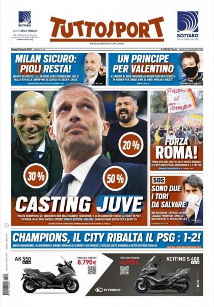 יובנטוס נכנסת לחמשת משחקי הליגה האחרונים כשהיא אוחזת בציפורניים במקום הרביעי המוליך לליגת האלופות. החדשות הרעות עבור הקבוצה של אנדראה פירלו הן שיובה השיגה רק 25 נקודות במשחקי החוץ שלה (קצת יותר מ-50% הצלחה) ונותרו לה עוד שלושה משחקי חוץ עד תום העונה. בכלי התקשורת בארץ המגף ממשיכים לעסוק בזהות המאמן לעונה הבאה כשברור שפירלו יפוטר אם לא יגיע לליגת האלופות. בשער "טוטוספורט" עסקו בשלושה שמות עיקריים.