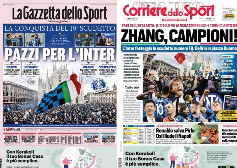 בכלי התקשורת פרגנו לאינטר. "הסקודטו ה-19 נכבש על ידי אינטר המשוגעת!", נכתב ב"גאזטה דלה ספורט". נכתב כי קונטה הוא "איש החלומות" של המועדון. "ז'אנג, יש לך אליפות!", נכתב על הבעלים הזר שזכה בתואר. "שמחה בלתי ניתנת לשליטה, לפחות 30 אלף אוהדים חגגו ברחובות", נכתב ב"קוריירה דלה ספורט" שם גם עסקו בתוכניות לעונה הבאה. "אינטר, אתם הכי טובים!, גאים בך, אלופת איטליה החדשה", הייתה הכותרת ב"טוטוספורט".
